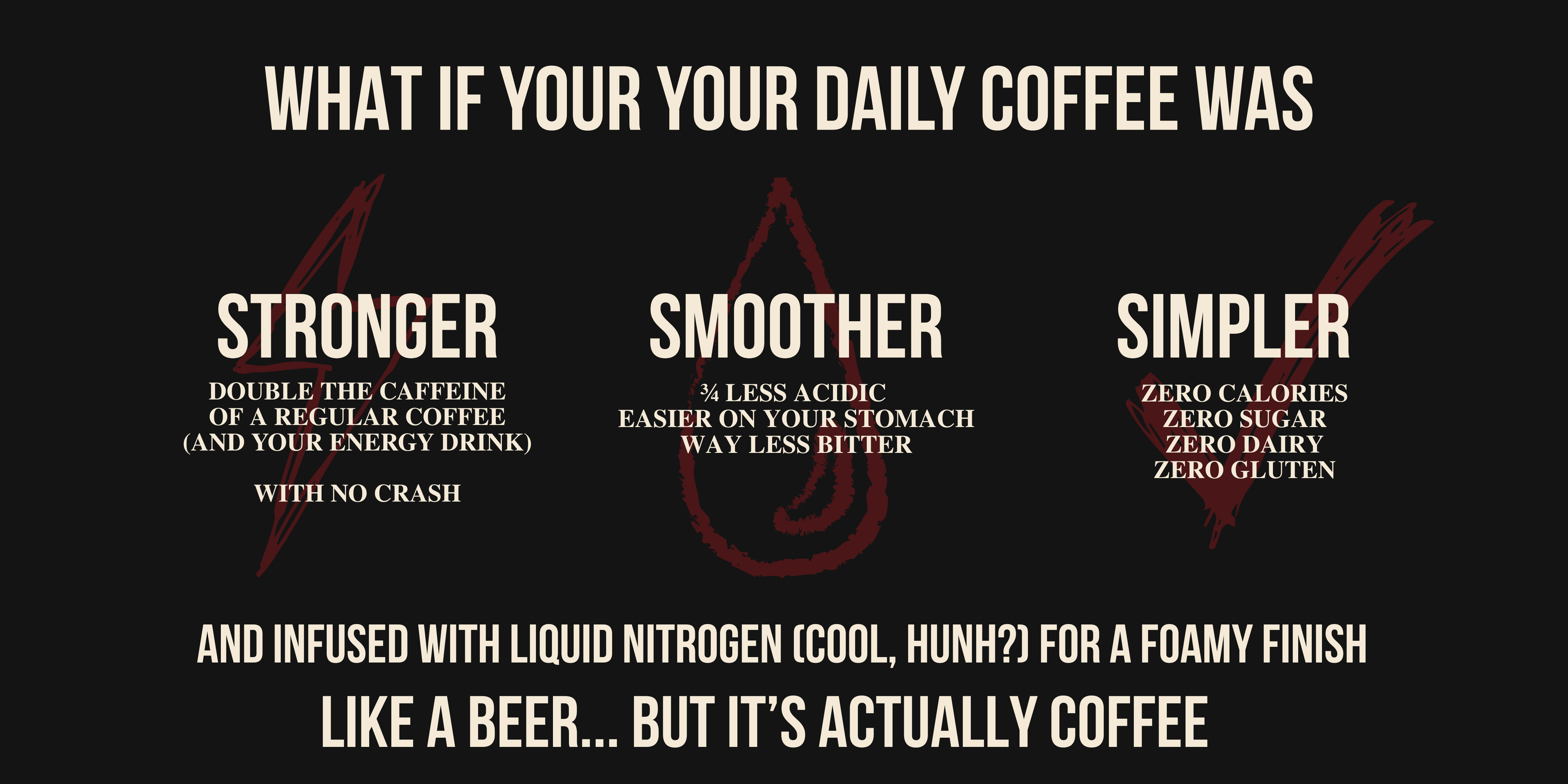 This coffee works as hard as you do. Zero sugar. Zero dairy. Zero calories. Zero Gluten. All the kick, none of the junk and no crash.